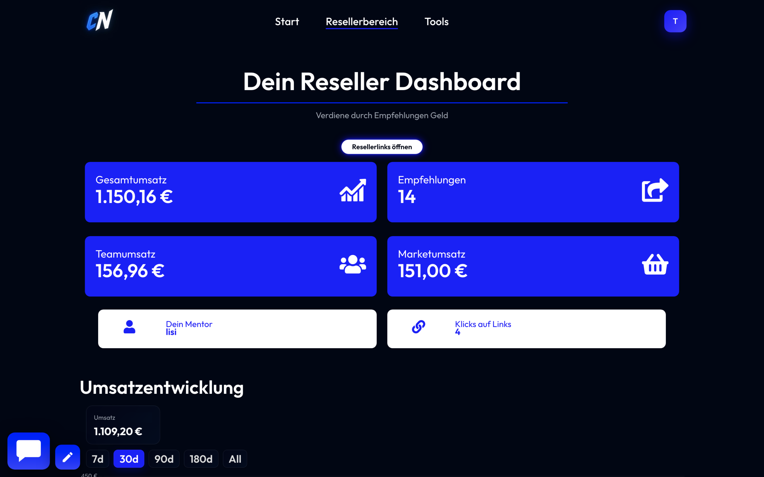 Du kannst die Plattform selbst weiterempfehlen und daran Provision verdienen. Zusätzlich kannst du Produkte aus dem integrierten Marktplatz teilen und ebenfalls Einnahmen generieren.